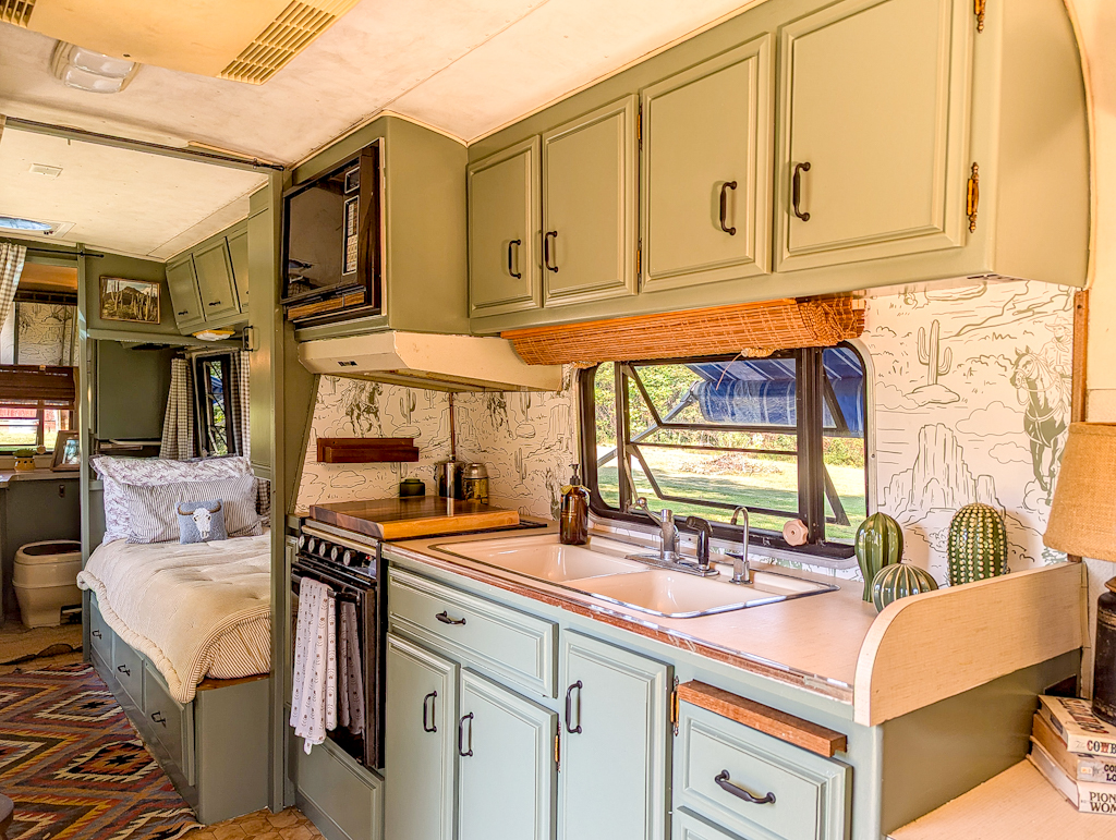 - “Dried Thyme” painted cabinetry, new hardware and “American West” wallpaper throughout
