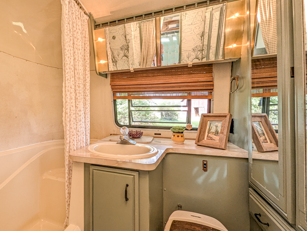 - Refurbished tankless water heater, flushing toilet, large tub/shower, wardrobe/linen cabinets, built-in hamper, and retro glamour mirror/medicine/vanity cabinet
